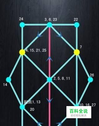 第94关:一笔画游戏第九十四关包含两个重复点,四条重复线条,四条定向线条,如图所示从左边中间的起点1出发,经过1-27点,可完美过关。