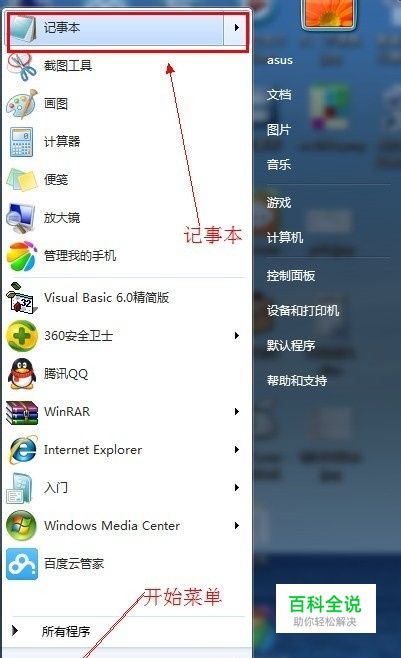 点击“开始”菜单,“记事本”,或“所有程序”—>“附件”—>“记事本”。