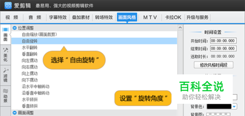 一、导入视频,把视频调整为正常画面 首先,我们先点击“添加视频”按钮,将视频悉数导入爱剪辑中。 接着,在“画面风格”左侧栏“画面”,点击“自由旋转”特效,并在“角度”一栏设置旋转的角度后,点击“添加风格效果”按钮,为当前的片段或指定时间段内的视频一键应用,将倒放的视频调整为正常画面。