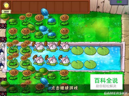 完成最终布局(其实这个布局也是被僵尸逼出来的,感觉只能这么放了,可能比较适合我,当然还有很多其他方法呢)。 猫草种在水路三、四、五列 种上西瓜冰瓜 西瓜种完冰瓜完成 摘上南瓜套 可以种上吸金菇