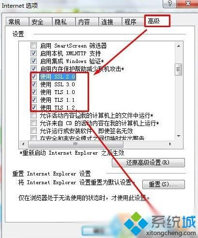 2、在“Internet 选项”界面点击“高级选卡”,在设置框中将“使用SSL 2.0”、“使用SSL 3.0”、“使用SSL 1.0”、“使用SSL 1.1”、“使用SSL 1.2” 5项勾选起来,点击应用并确定;