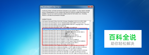 2.打开Windows Install Clean Up进行深度清理。注意:该工具的四个按键功能分别为(Select all)查找全部,(Clear all)清除全部,(Remove)删除选中项,(Exit)退出。使用时只需选择带有SQL 部分进行Remove即可。