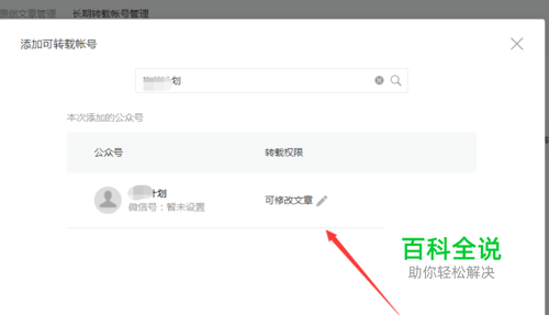 点击一下编辑的按钮,我们可以设置该公众号的权限“可修改文章”和“可不显示转载来源”,这样就完成了白名单的设置;