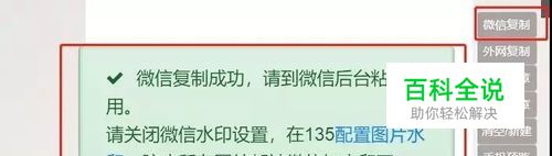 文章导出 文章导出到微信公众号后台一共有两种方式。 ①微信复制 操作流程: 我的文章➨选择要导入的文章➨点击编辑➨点击编辑器右侧微信复制(如果页面跳出如下图所示页面,就证明复制成功,如果没有跳出页面显示,建议再次点击)➨打开微信公众号后台➨点击素材管理➨新建图文➨ctrl+v(黏贴)➨保存 下面第一张图表示:微信复制成功页面显示 第二张图:微信复制操作流程 ☝温馨提示:文章导入到微信公众号后台之后同样可以编辑 ,只不过微信自带的编辑功能较单一。同时需要在微信后台去上传文章封面图,以及填写题目、作者、原文链接等信息和开启留言等功能。