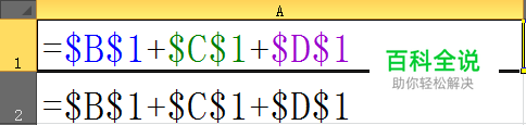 例:在a1中输入公式“=$B$1+$C$1+$D$1" 当它填充到A2时就保持不变