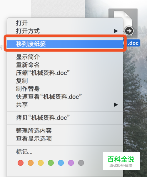 第二个方法,我们在文件上点击鼠标右键,在弹出的对话框中选择【移至废纸篓】就可以将文件移动至废纸篓中。