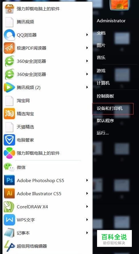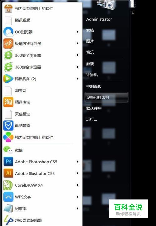 打开电脑左下角的“开始”按钮,得到菜单,在菜单上找到“设备和打印机”;如下图所示;