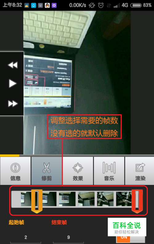 2.图像的修剪 可以通过图像修剪来 去掉效果不好的图像 (1.调整需要的帧数,通过移动 黄色浮标设置起始帧, 移动红色浮标设置结束帧 showing frame 删除当前显示的图片