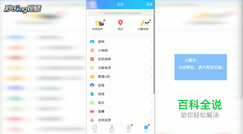点击菜单底端“动态”按钮,点击“附近”,进入附近页面。
