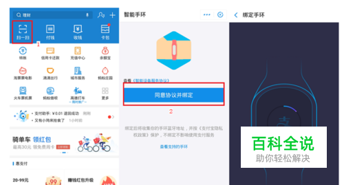打开手机上的支付宝 App,使用“扫一扫”扫描手环上的绑定页面,点击 “ 同意协议并绑定”,进入绑定环节 。