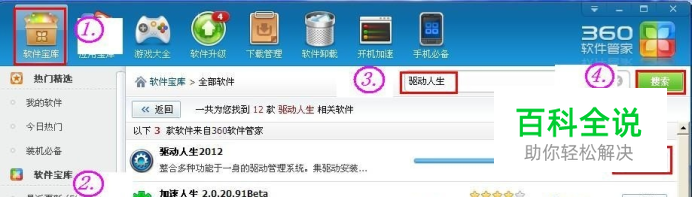 1.打开360软件管家在搜索栏中输入驱动人生进行搜索,点击下载,完成后点击安装键,按照提示
