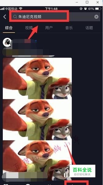先拍几张照片、一段视频,将照片和视频放一起并录屏,合成一个视频,然后进入抖音搜索“朱迪尼克视频”,找到后点击“分享”箭头。