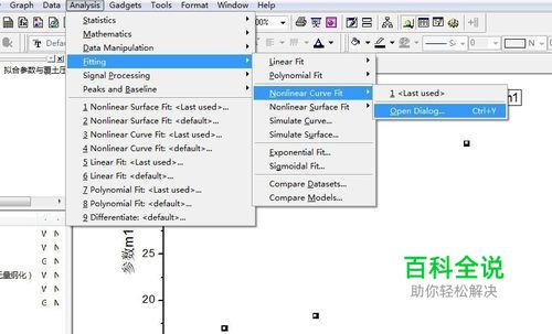 选中散点图中的点,点击工具栏Analysis——Fitting——Nonlinear Curve Fit——Open Dialog,打开曲线拟合对话框。 注意:一定一定一定要先选中散点图中的点,再点击工具栏!