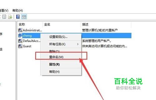 在打开用户列表之后,右键点击需要修改的用户名,在弹出的界面中点击选择“ 重命名”选项,即可开始重新修改登陆的账户用户名。