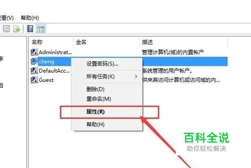 修改掉用户账户名之后,我们还可以修改用户账户全名,在计算机用户管理页面中击右键,在弹出的右键菜单中选择“ 属性”选项。