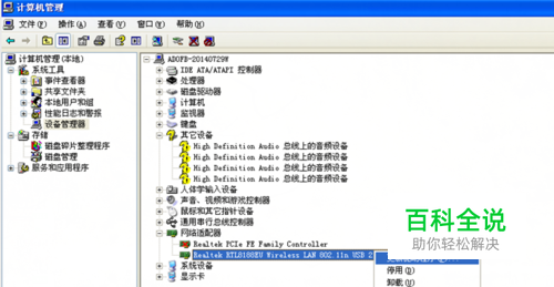 选择【设备管理器】,在网络适配器中你会看到你的网卡,无线网卡会有wireless的字样,如果驱动未安装,会显示黄色问号。在这里我的电脑已经安装了驱动,所以没有显示。