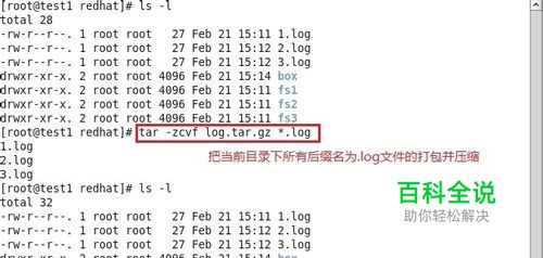 把当前目录下所有后缀名为.log的文件打包并压缩(tar.gz包)。之后再进行解压缩和解包。