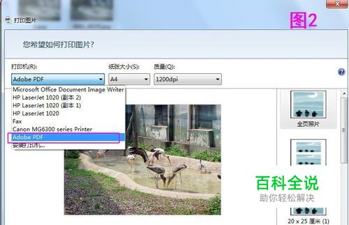 3、在弹出的打印图片对话框中,由于安装了Adobe Acrobat软件,咱们在打印机下拉框在中选择“Adobe PDF”,然后点击“打印”。如图2所示。