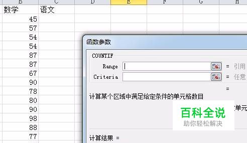 为了直观,小编直接 在excel中输入相关数据。 题目需要是: 用COUNTIF函数公式计算出数学成绩大于等于75的人数。 所以在这里, Range里面填入 全部数学成绩 不是文字 !而是单击 然后用鼠标选进去 Criteria里面填入 >=75 敲黑板 不要把名称也选进去了喔