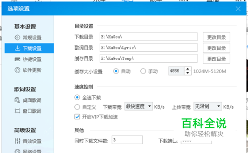 打开酷狗音乐播放器,点击:主菜单—设置—在“基本设置”里面的“下载设置”。