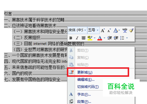 更新目录,当我们做好一篇文档的目录时,因为后期正文的排版等等,导致标题所在页数发生变化,这时候我们需要用更新域更新目录
