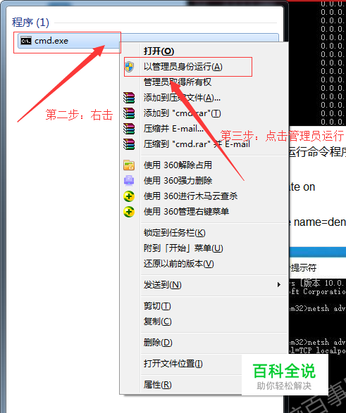 首先,以管理员的身份运行“命令”程序,打开步骤如下图: