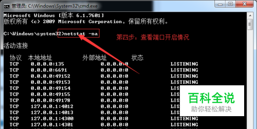 然后我们查看一下我们系统哪些端口正在运行。在“命令”程序窗口中输入netstat -na可以查看系统所有端口状态。