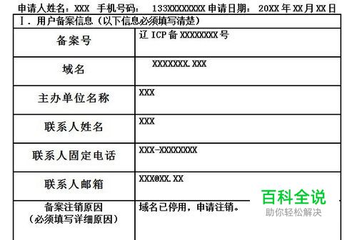 把【注销备案申请表】里的信息填好 1.备案号 写上申请删除备案号域名的备案信息 2.域名 申请删除的域名 3.主办单位名称 申请删除备案号的主体信息 4.联系人姓名 这里写上你的信息 5.联系人固定电话 写上你的电话 6.联系人邮箱 写上你的邮箱 7.备案注销原因 把原因写清楚,停用域名、单位变更等。越详细越好