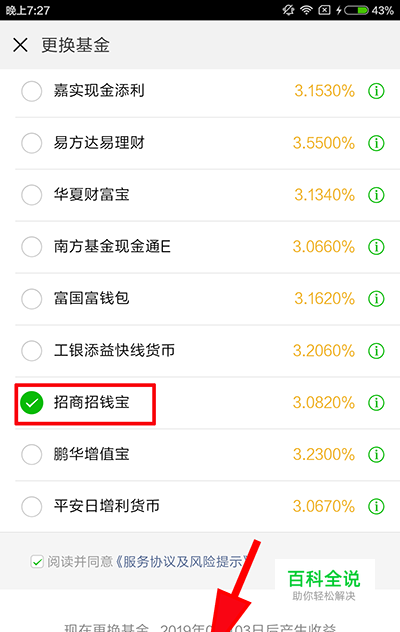 这里就是我们可以选择的全部零钱通投资平台。选择后点击“更换”输入支付密码即完成选择,每天只限一次。