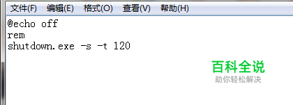 打开文档。 输入以下内容: @echo off rem shutdown.exe -s -t 120 说明:-s是关闭本机。-t是倒计时时间,单位是s。 例如上面的命令就是120s后关机。 如果想让它2小时候关机,就设置成7200。因为60*60*2=7200.