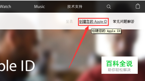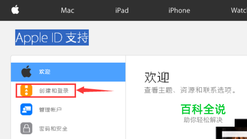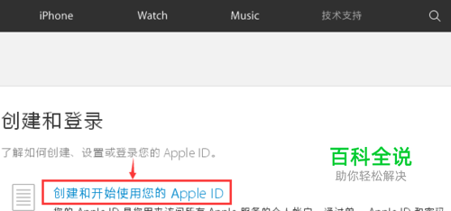 在Apple ID 支持页面,我们首先点击左方导航栏中的 “创建和登陆”按钮。 页面跳转,在创建和登陆界面,我们点击 “创建和开始使用您的Apple ID”。