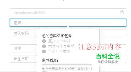 我们需要注意的是,我们填入相应方框里的内容时,旁边可能会有提示,我们要看清楚提示内容,不然注册就无法完成。