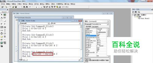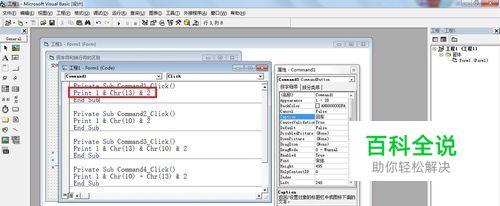 双击“回车换行”命令按钮,进入代码编辑窗口,输入如下代码: Print 1 & Chr(13) & Chr(10) & 2