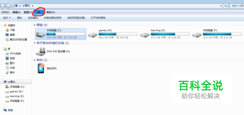 打开我的电脑,点【工具】(在左上角我的工具栏中第四个)