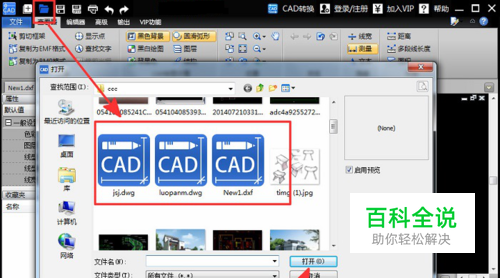 然后点击顶端的文件打开按钮,在弹出的新窗口中选择要查看的‘dwg文件’,之后点击窗口中的‘打开’按钮即可。