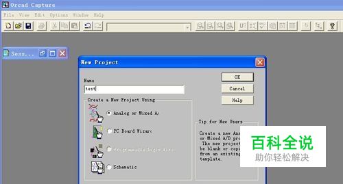 给工程取名字,因为要做Pspice仿真,所以选择Analog or Mixed A/D(数模混合仿真)。其它几项意思为PC Board Wizard(系统级原理图设计)、Programmable Logic Wizard(CPLD或FPGA设计)、Schematic (原理图设计) 。