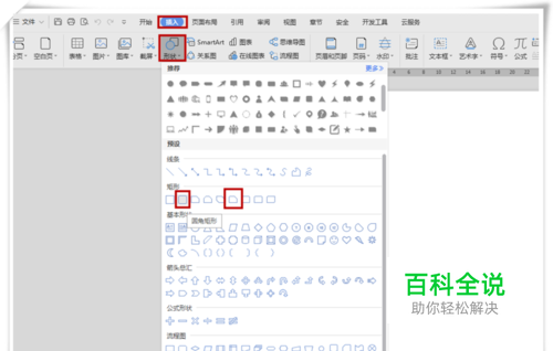 【插入形状】 打开 Word 文档 切换到 “插入”菜单,单击 “形状”右侧下拉箭头选择自己喜欢的形状插入到页面,小编这里以圆角矩形为例。