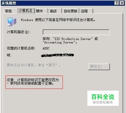 计算机名称不能更改如何解决?问题起因:今天需要从公司服务器上Copy备份的文件,能够远程桌面登陆到这台服务器上,这台服务器已经加入到域中,因此想通过共享的方式来进行Copy。但是尝试时发现并不能实现共享,难道此机器没有真正加入到域中吗?于是查看计算机名,我的电脑->计算机名->发现计算机名无法更改,同时也无法退出域,更改按钮为灰色,界面如下图: