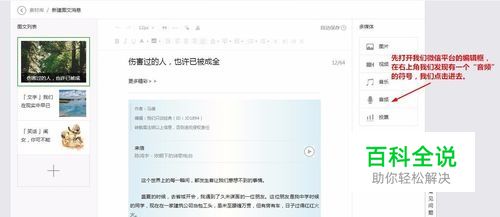 先打开我们微信平台的编辑框,在右上角我们发现有一个“音频”的符号,我们点击进去