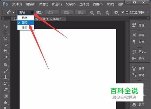 接下来在属性栏上第二个按钮处点击,选择路径。如图所示。