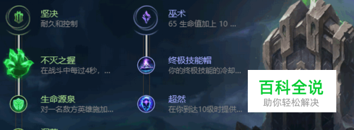 坚决:不灭之握>生命源泉>调节>过度生长 巫术:终极技能帽>超然 上单石头人还是以出肉为主,所以点出坚决天赋、并且点出过度生长,不停的提高自己的生命值以及坦度