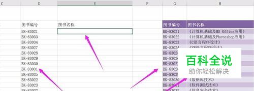 在本例子中,需要按照“图书编号”,从右边的表格中寻找“图书名称”,并把名称添入到中间的单元格中。为此,先选中中间的单元格。