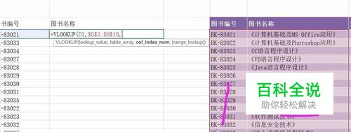 第一个参数可以理解为“线索”,也就是你有我也有的东西,我们要根据这条线索来寻找对应的值。在本例子中,这条线索就是图书编号了。所以直接选择D3单元格的图书编号。