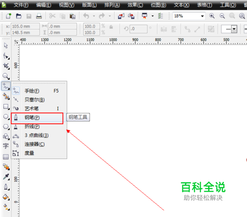 如图所示,我们在弹出的下拉列表菜单中,我们点击箭头所指的“钢笔”工具。