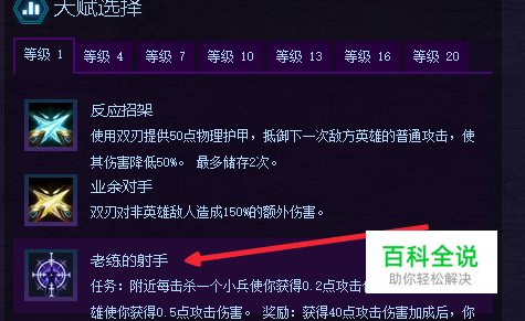 级别1:老练的射手 任务技能,最高提高40点伤害和增加一个攻速主动技能,加成30%,1v 1单挑比较厉害,配合被动的护盾