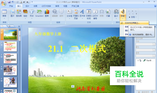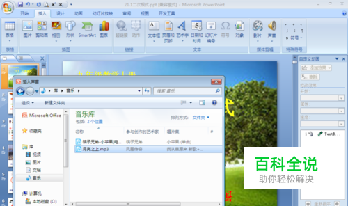 在PPT2007中插入音乐后,可以设置在一页中播放,可以设置跨幻灯片播放,也可以设置在几页中进行播放。不同版本的PPT音乐播放的设置有所不同,怎样在PPT2007中设置音乐跨幻灯片播放呢?下面请分享我的。