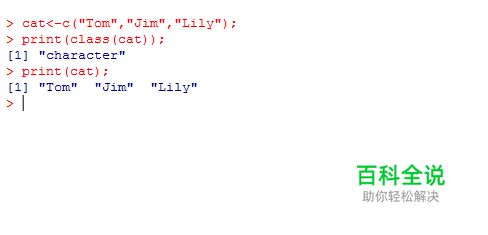 第一步,声明变量cat,并利用c函数赋值,元素是由不同的字符串组成;利用class查看cat基本数据类型并打印cat元素值,如下图所示: