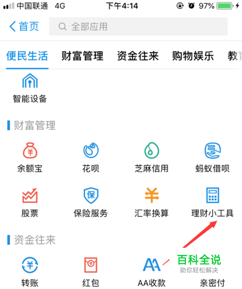 打开全部应用页面后,我们找到财富管理——理财小工具,点击将其打开