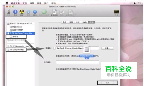 格式化完毕后,选择恢复,源磁盘选择您的系统安装文件即可,目的磁盘就是您格式化好的磁盘分区了,用鼠标拖到框里面即可。一切妥当,点击恢复,将会进入U盘制作过程,一般耗时大概20分钟左右,根据您的U盘速度而定。