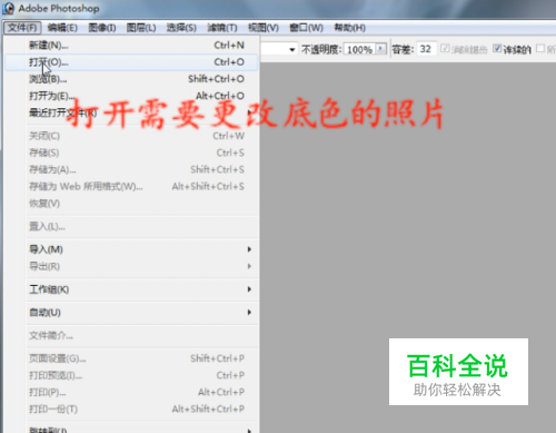 打开Photoshop软件后,点击“文件”选择“打开”载入要更改底色的照片